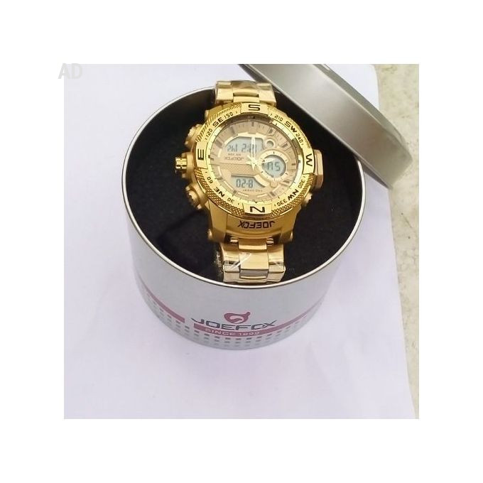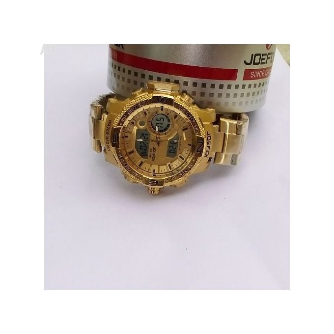 AlarmWater resistant sport watchGender: MenDial Type: Analog & Digital (Gold)Band type: BraceletBand material: Gold chainMaterial: Gold Chain with PlasticOccassion: This is suitable for official outings as well as casual outings.Date: Yes, it has functionality for telling the date and day.Special Feature: 2 Timezones